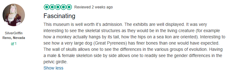 This musuem is well worth a visit! The exhibits are well displayed and so interesting. Check out different skeletal structures and so much more!